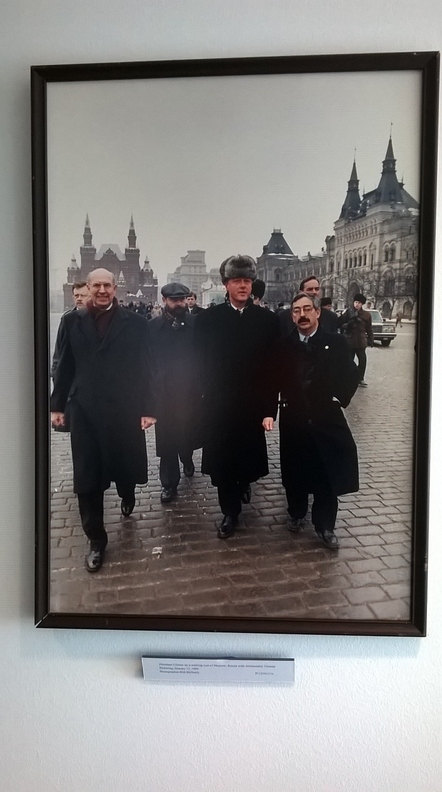 Last week, Joseph and I decided that it was about time that we as GA’s start and finish a major project. To be more specific, we decided that the pictures on display up on the 3rd floor for the Archivists to view needed to be switched out for more exciting pictures. We decided that our theme would be “The Clinton’s Abroad”, and went through the many (MANY) pictures in storage and found great pictures of either Hillary or Bill Clinton during their time in office, specifically them traveling abroad. One of my favorites is the one to the right. This is Bill Clinton in Russia. Look at that hat! I can’t believe how cold it looks there…and then I think of how cold it actually is where I am living!