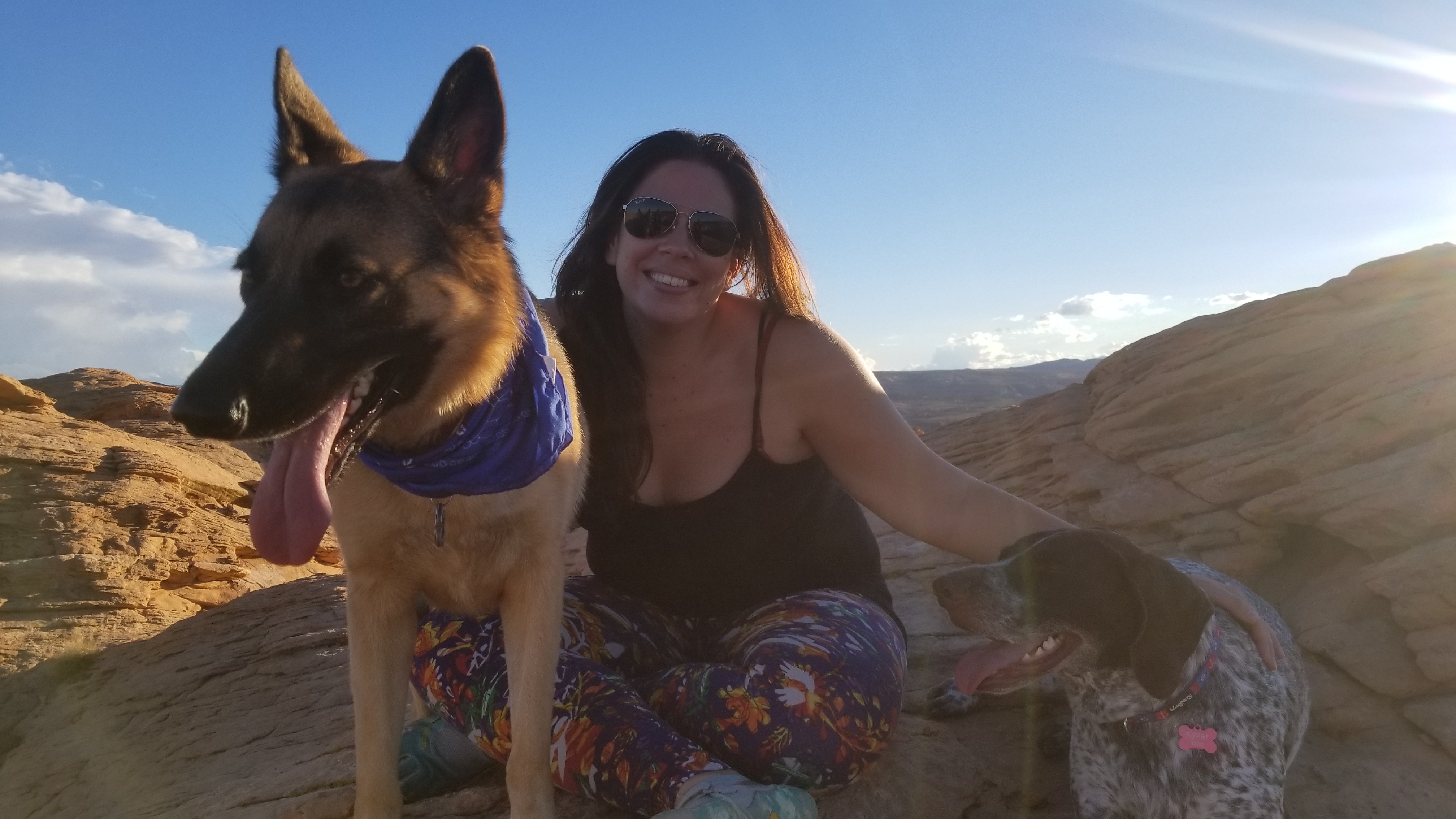 Kiraly is almost the exact opposite of Kyzer. She is much more caution, doesn’t quite like making friends with everyone instantaneously, and very much so loves her tennis ball (so don’t take it away from her for long!) But when you get her outside, she is a completely different girl! She adores chasing after her big brother and loves being out in the middle of nowhere exploring. There are many poisonous animals in the desert so we’ve started a regiment where we keep the dogs moving – no sniffing too long in a bush in the desert! Kiraly is not as interested in sniffing as Kyzer is, her favorite thing is running back and forth between all of us and giving kisses whenever possible. We take a lot of precautions with the dogs, though, and take a lot of time trying to be as educated as possible about the landscapes we visit. Here in the desert it is very dry, there are less places for shade, and many conveniences are located hours if not days away. When we pack for a weekend camping trip we pack a gallon water per person/animal and always pack about a days worth of food extra just in case.
