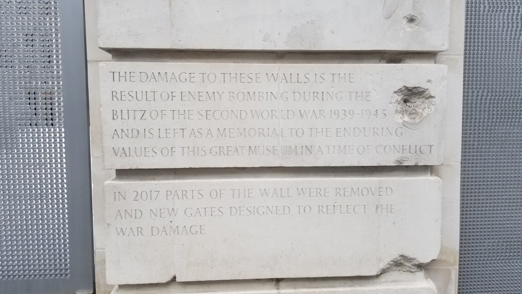 I have never quite been a fan of roses, but there were so many rose Garden’s in London I became a fan pretty quickly. The Queen Many’s Garden’s was beautiful and includes over 12,000 roses. The London Zoo was right above Regent’s Park and close to our location as well, but we only walked around the garden permeter. Neither of us were the biggest fans of zoos (no offense, they are great!) and we just wanted to keep walking. We ended up at Princess Diana’s Memorial Fountain. There were many children playing in the fountain and enjoying the nice weather. My mom had always been a fan of Princess Di and to see a gorgeous area for kids to play made me smile – I’m sure she would have loved it. Most of London reminded me of Baltimore or Philadelphia. A large city with historical buildings with visitors queued outside for hours and gorgeous structures. When we walked around downtown London I was historically and happily surprised to see the damage done during World War II was left for visitors to view. What a great way of showing the horrors of war for future generations! Later when we went through the military museums we would notice the pride and honor on full display of the British military. I always love visiting museums when I travel because it’s the best time for the people of that nation to show their successes and failures – basically their history. As a history nerd I’m all in!